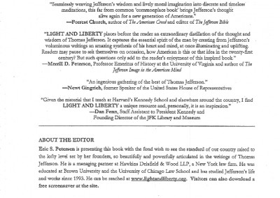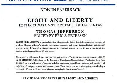Eric S. Petersen is the editor of a book of Thomas Jefferson’s writings entitled Light and Liberty: Reflections on the Pursuit of Happiness. In it he has brilliantly laced together the eloquent genius of Thomas Jefferson. Happiness, hope, liberty and peace are among the elevating topics in Jefferson’s own words compiled after ten years of studying his reflections in reports, state papers, speeches and twenty thousand letters.